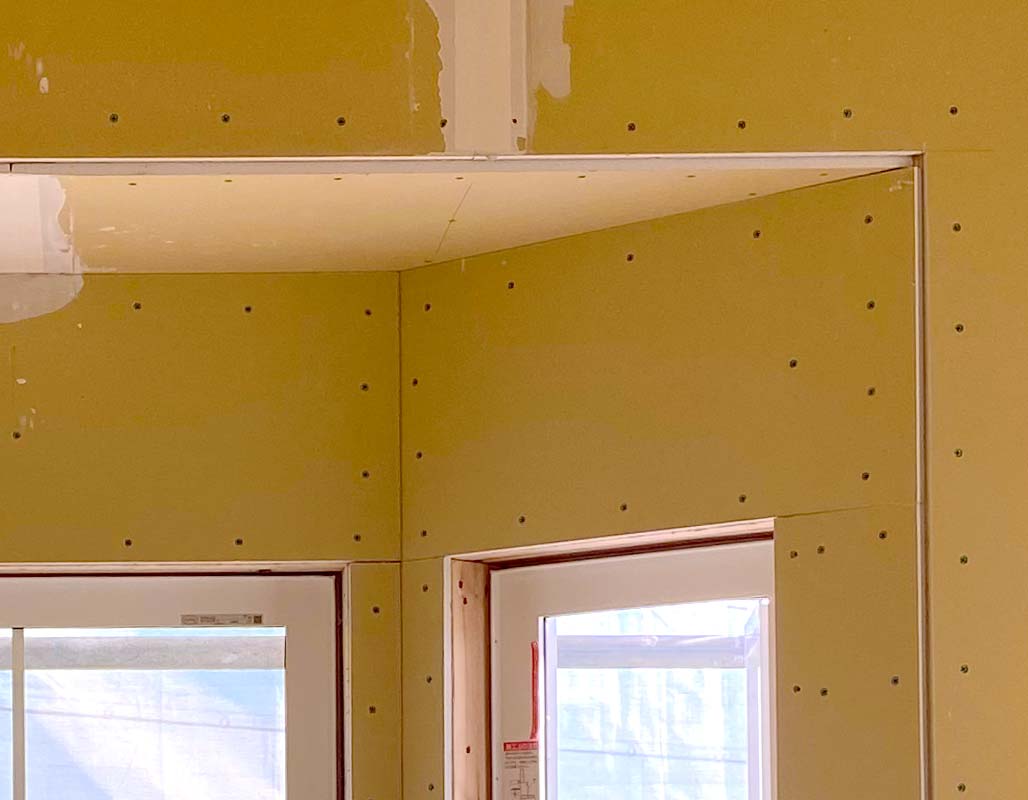 ボードを止めるのは釘ではなく、もちろんビス止めです。そして、窓やドアの開口部の角にジョイントをしないでかぶせて張っていきます。